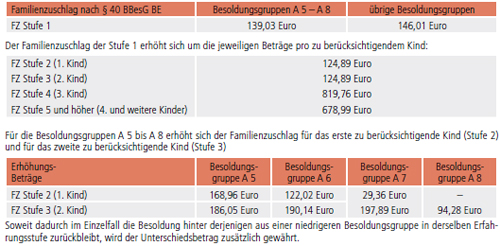 Für die Besoldungsgruppen A 5 bis A 8 erhöht sich der Familienzuschlag für das erste zu berücksichtigende Kind (Stufe 2) und das zweite zu berücksichtigende Kind (Stufe 3)